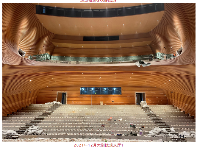 大劇院內(nèi)部的施工進(jìn)度很快,短短的5個月,完成了從“鋼筋森林”到“精致劇院”的華麗轉(zhuǎn)變。大劇院內(nèi)部經(jīng)過聲學(xué)計算和模擬,側(cè)墻均采用硬質(zhì)擴(kuò)散造型,保證場內(nèi)的音質(zhì)環(huán)境,后墻采用成品MLS擴(kuò)散體,全場流線型的造型連貫、大氣。造型的角度、造型的尺度以及造型的面密度都嚴(yán)格按照聲學(xué)控制來落地。